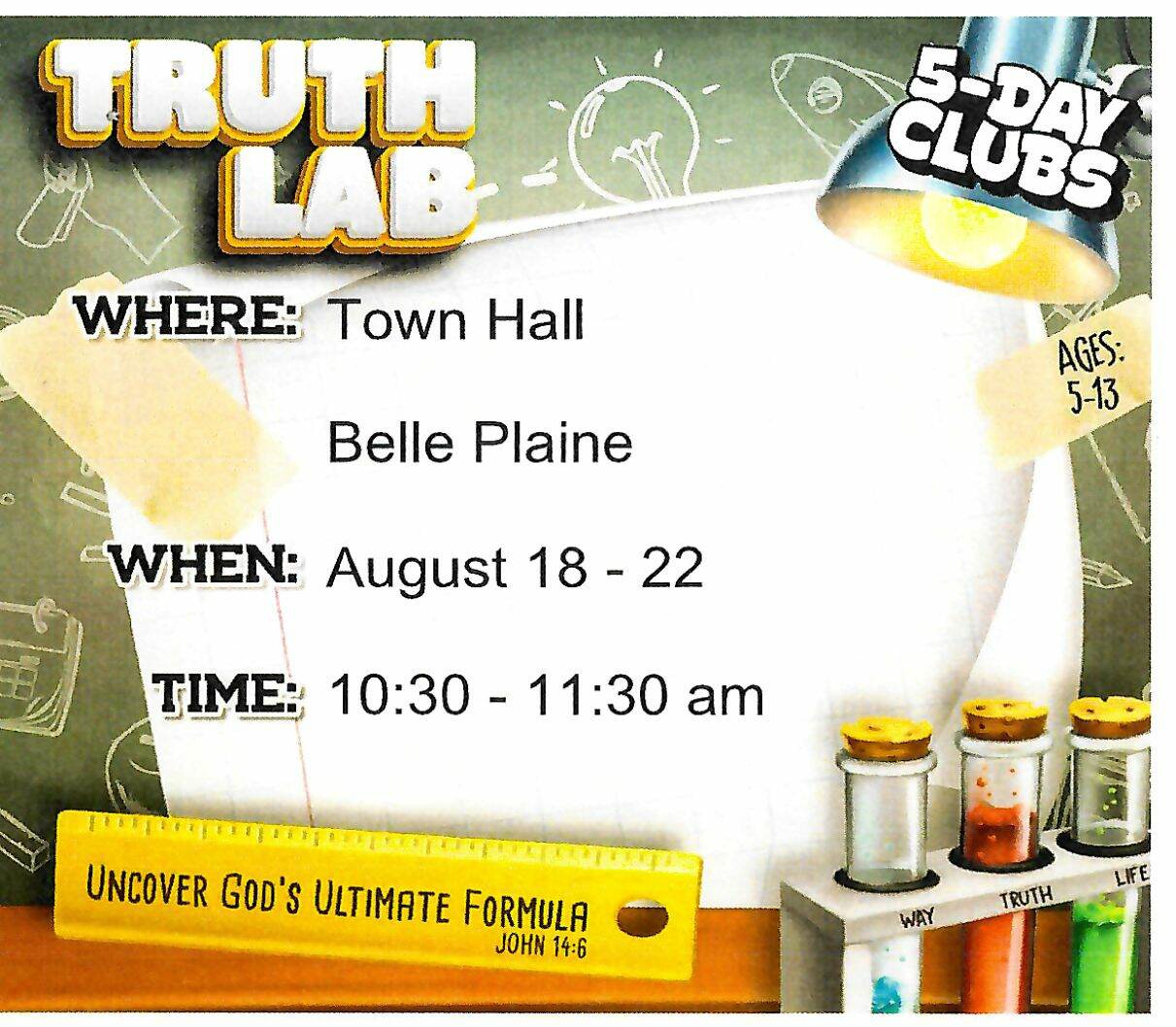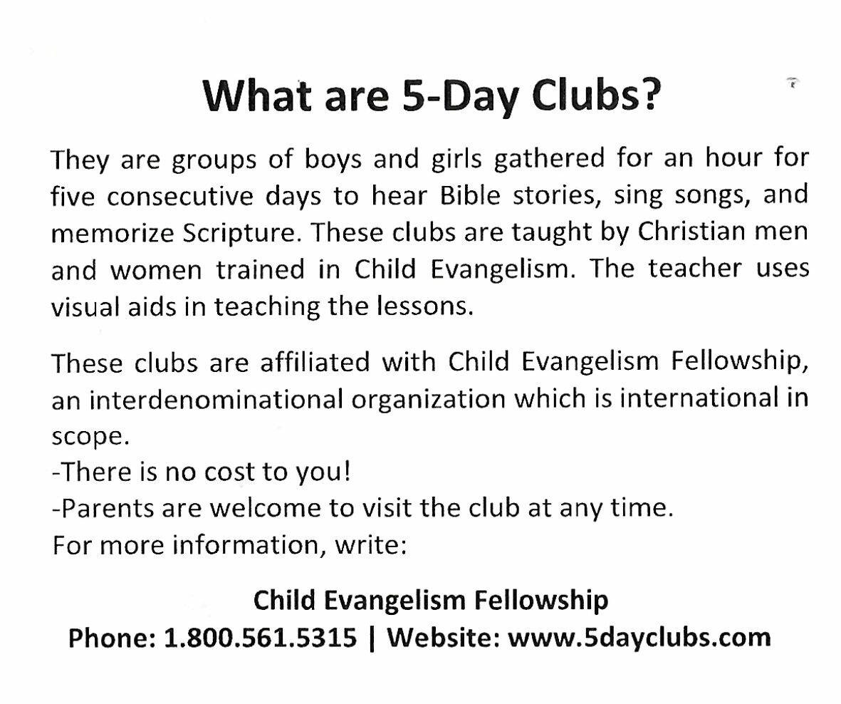 Day Camps – August 18-22 from 10:30 am to 11:30 am at the Community Hall 111 Coteau St. Available to all kids ages 5-13 . Songs, Bible Viewer, Prizes. No Cost